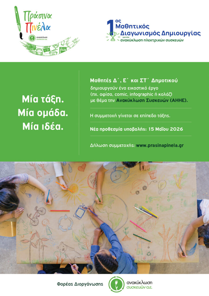 Η Ανακύκλωση Συσκευών Α.Ε. ανακοινώνει την έναρξη του 1ου Μαθητικού Διαγωνισμού Εικαστικής Δημιουργίας για την Ανακύκλωση Συσκευών, με τίτλο «Πράσινα Πινέλα», για τη σχολική χρονιά 2025–2026.