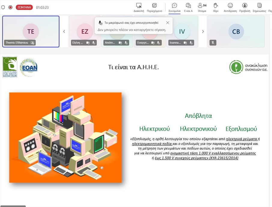 Παράλληλα, σε συνεργασία με τη NoWaste21, στις 25 Νοεμβρίου απευθύναμε ανοιχτή πρόσκληση προς τα σχολεία πρωτοβάθμιας εκπαίδευσης για συμμετοχή σε διαδικτυακή εκπαιδευτική παρουσίαση. Οι μαθητές είχαν την ευκαιρία να γνωρίσουν τα οφέλη της ανακύκλωσης συσκευών, λαμπτήρων, μελανιών και τόνερ, καθώς και ολόκληρη τη διαδικασία συλλογής και επεξεργασίας των αποβλήτων ηλεκτρικού και ηλεκτρονικού εξοπλισμού. Την Online παρουσίαση παρακολούθησαν συνολικά 132 σχολεία από όλη την Ελλάδα. Στο πλαίσιο των δράσεων της EWWR υλοποιήθηκε και ειδικός διαγωνισμός από τη NoWaste21. Νικητής του διαγωνισμού αναδείχθηκε το Δημοτικό Σχολείο Αγίου Ιστιαίας Αιδηψού, το οποίο έλαβε δώρο ηλεκτρολογικό εξοπλισμό ως αναγνώριση της συμμετοχής και της προσπάθειάς του.